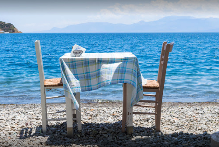 Ελληνικό ψητοπωλείο δίπλα στην θάλασσα, με ποικιλία από κρεατικά και σουβλάκια.
